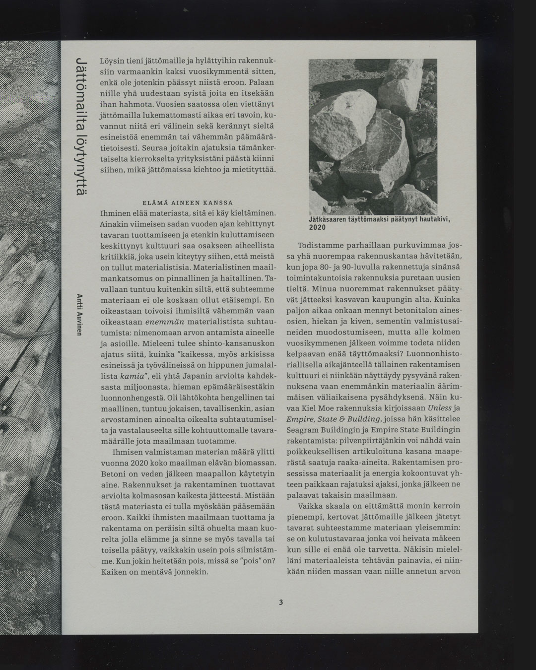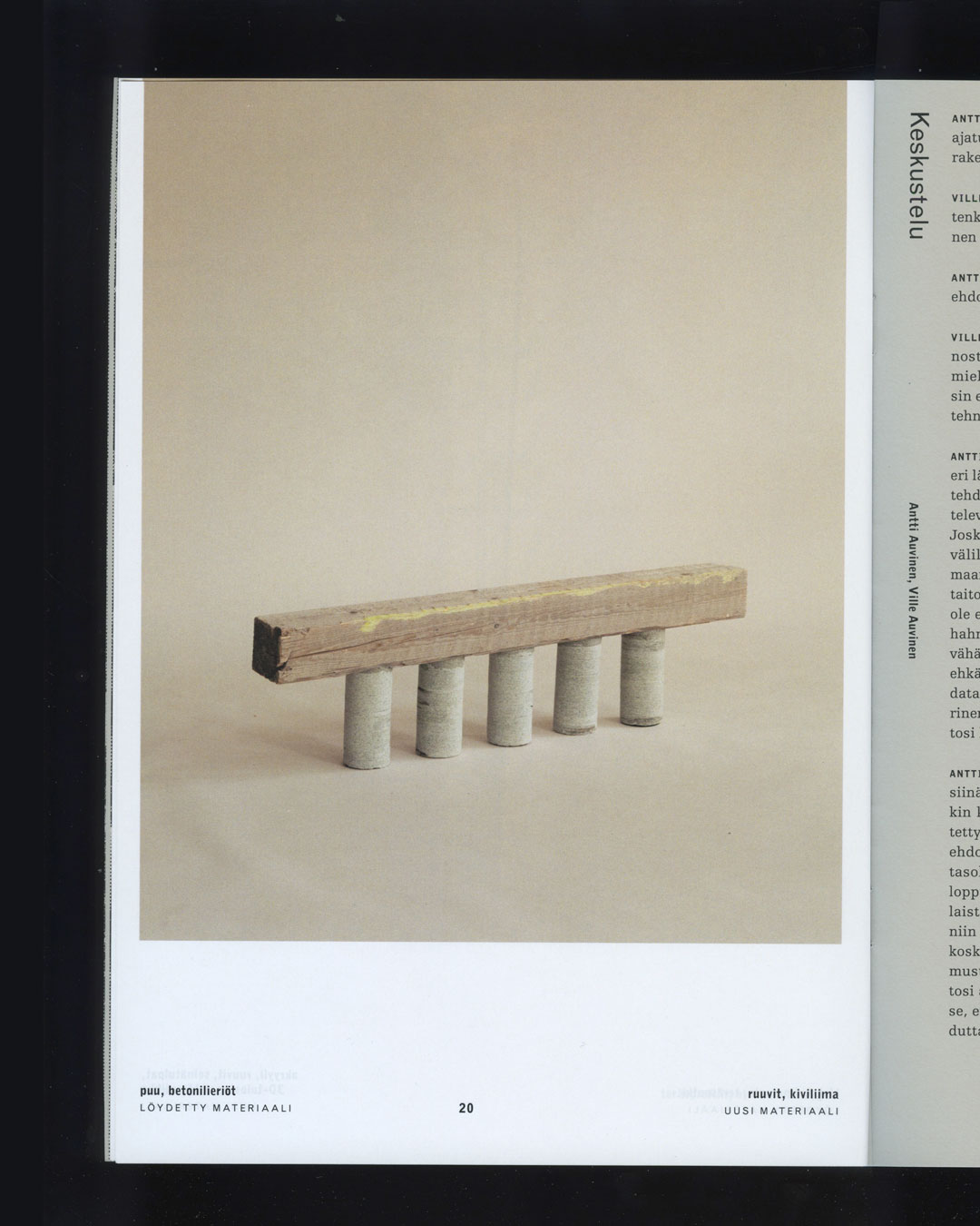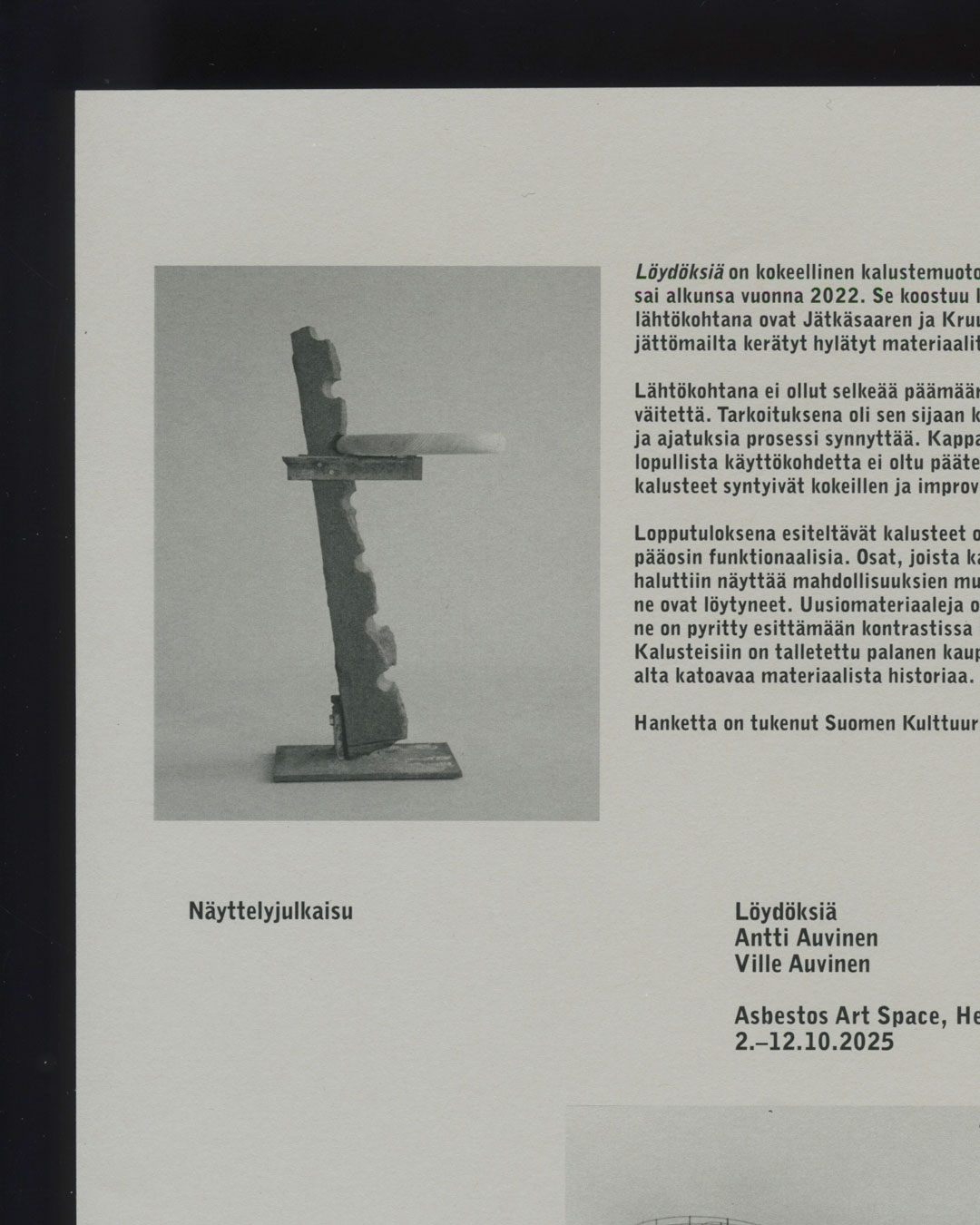 Design of Löydöksiä, an exhibition publication for an experimental furniture project by Antti Auvinen and Ville Auvinen.